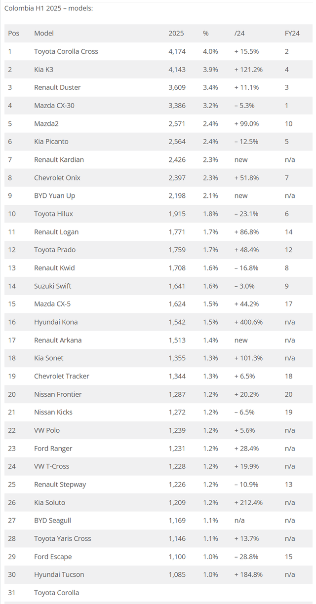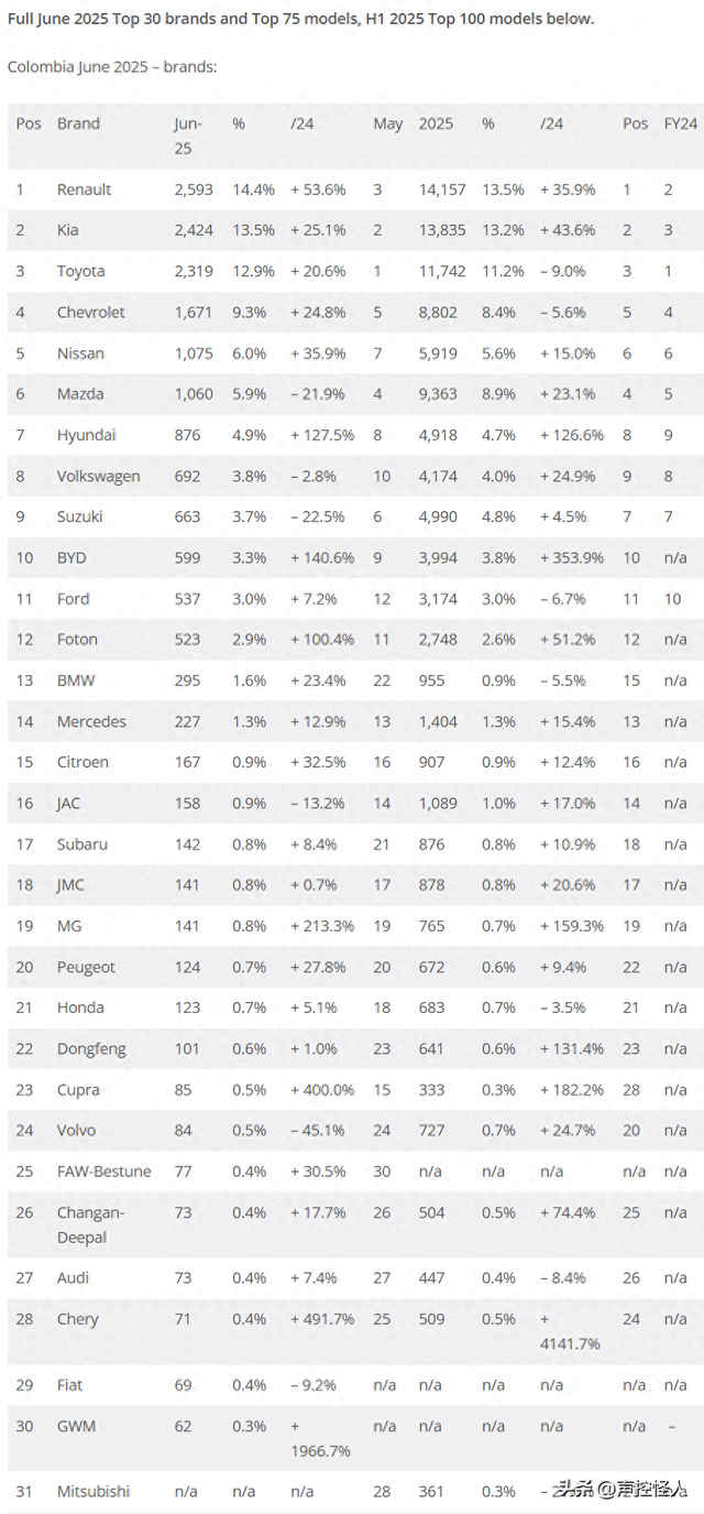 2025年6月哥伦比亚畅销车型前31