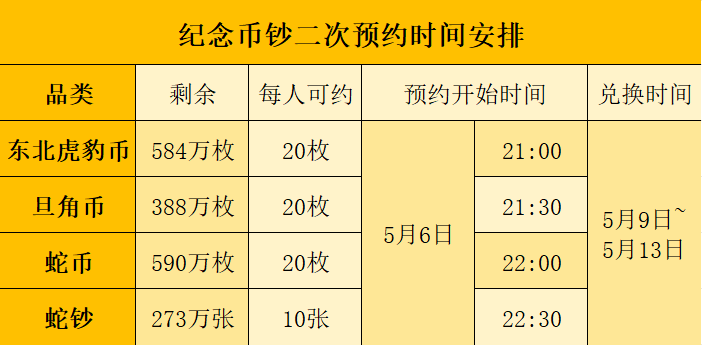 尽管这枚币的整体表现不尽如人意,但预约时仍有部分热门网点“秒光”。这也导致有很多藏友没约到。好消息是,剩余的889万枚雨林币,将会迎来二次预约。那具体预约时间是什么时候呢?参考上半年3币1钞(旦角币、东北虎豹币、蛇币、蛇钞)二次预约安排👇