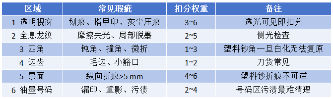 泰平把塑料纪念钞单独列为标准,70 分满分,主要扣分区 6 项: