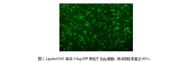在以 Hela 细胞为体外质控的基础实验中,使用Lipofect 5000转染GFP质粒,转染阳性率可达90%,展现了其在常规贴壁细胞中的高效转染性能。