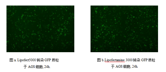 在与国际权威试剂 lipo3000 的对比实验中,两款试剂分别对AGS人胃腺癌细胞进行GFP质粒转染,24小时后荧光显微镜下观察显示,Lipofect 5000转染阳性率同样高达90%,转染效果与lipo3000 完全媲美,展现出与国际一线试剂比肩的转染能力。