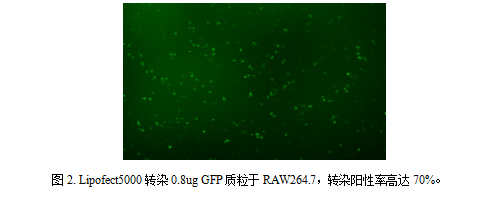 尤为值得一提的是,Lipofect 5000 对难转染的RAW264.7悬浮细胞也能实现高效转染。因RAW264.7细胞对质粒转染试剂亲和力较弱,即便是权威品牌Lipo3000也难以实现高效转染,而Lipofect 5000转染GFP质粒于该细胞系时,转染阳性率仍能达到70%,这一结果充分印证了其出色的全能转染性能。