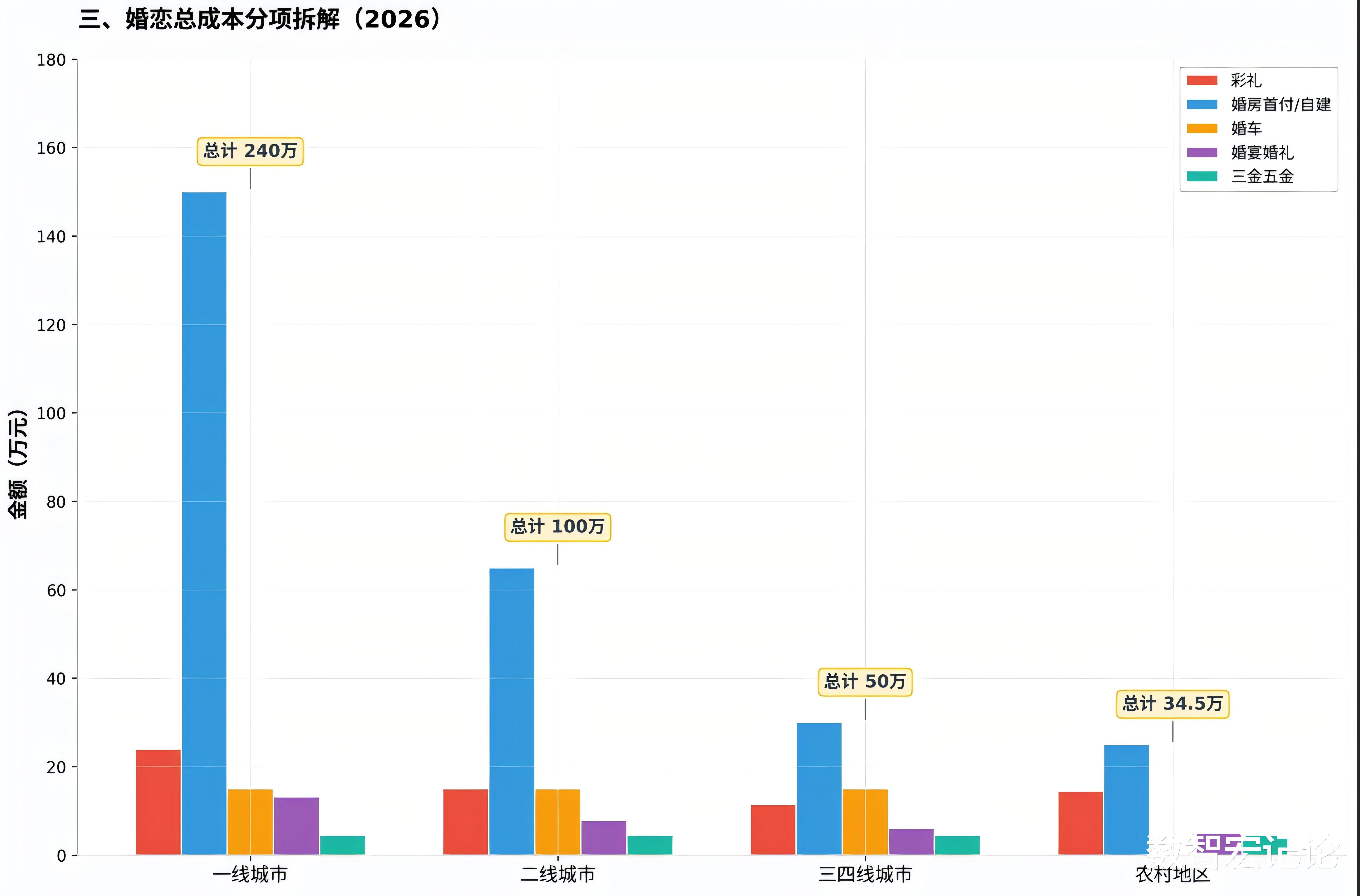 婚恋总成本:一线城市240万(婚房首付占绝对大头),农村34.5万