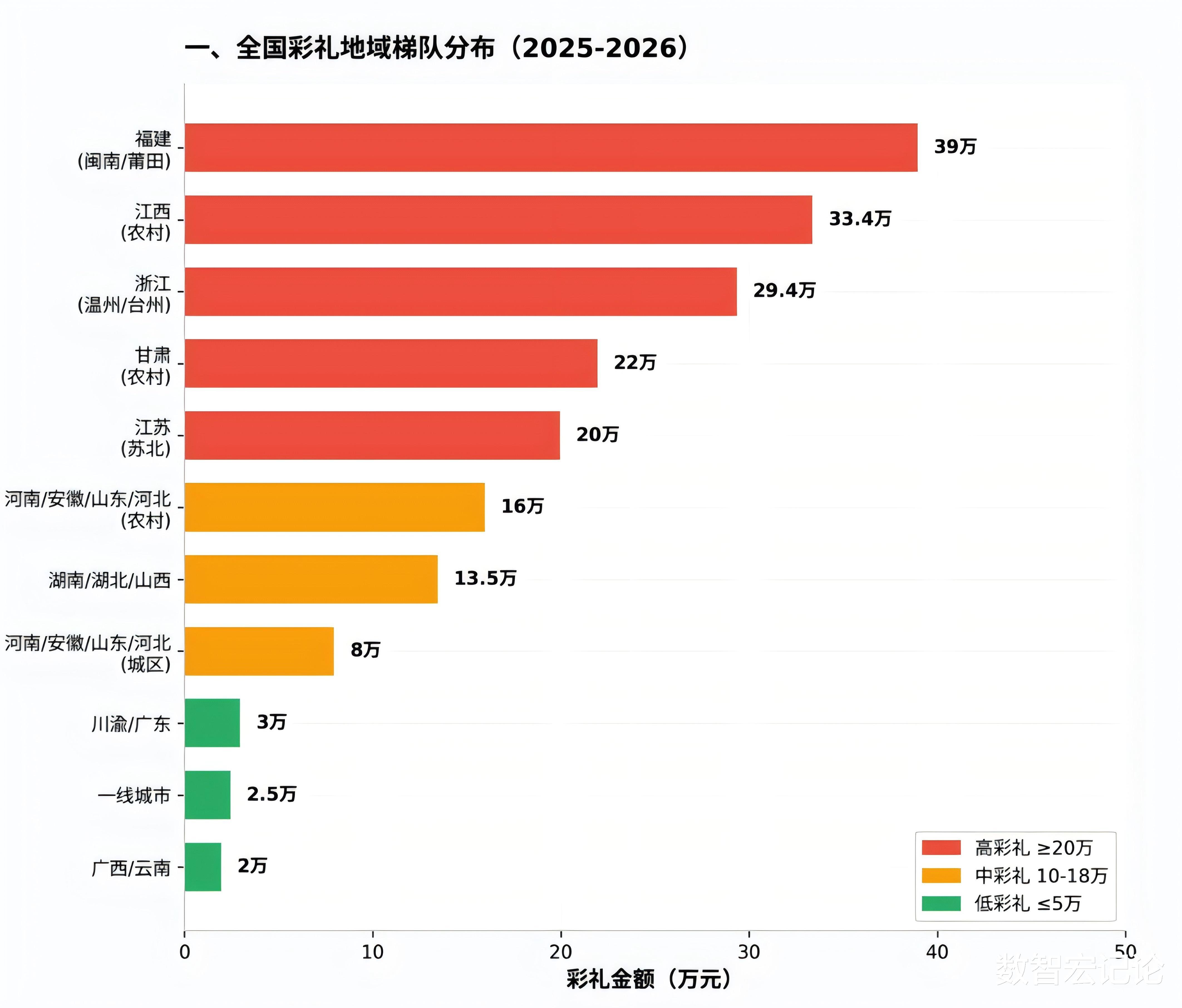 彩礼地域梯队:福建、江西、浙江位居前三,与川渝、一线城市形成10倍以上差距。