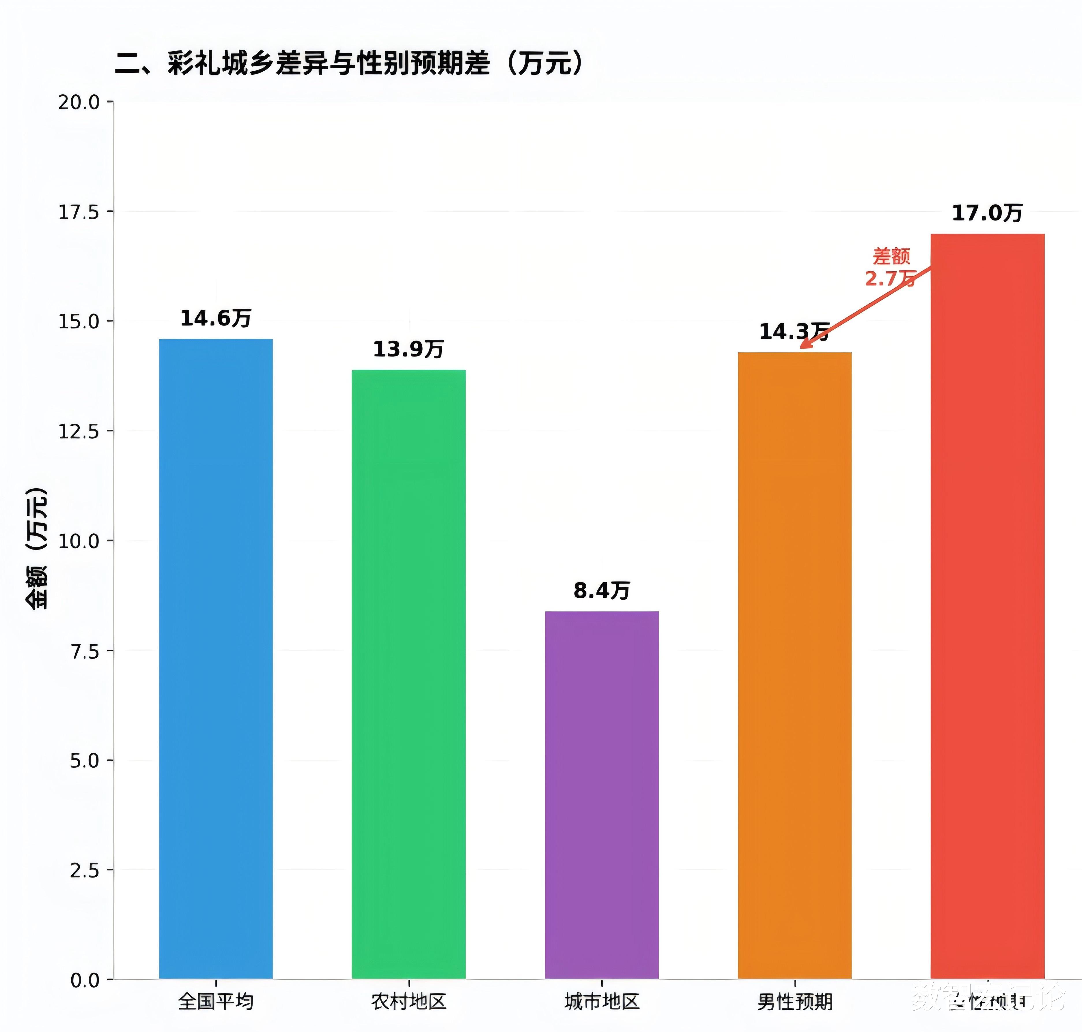 城乡与性别预期:农村13.9万 vs 城市8.4万,女性预期17万比男性高2.7万。