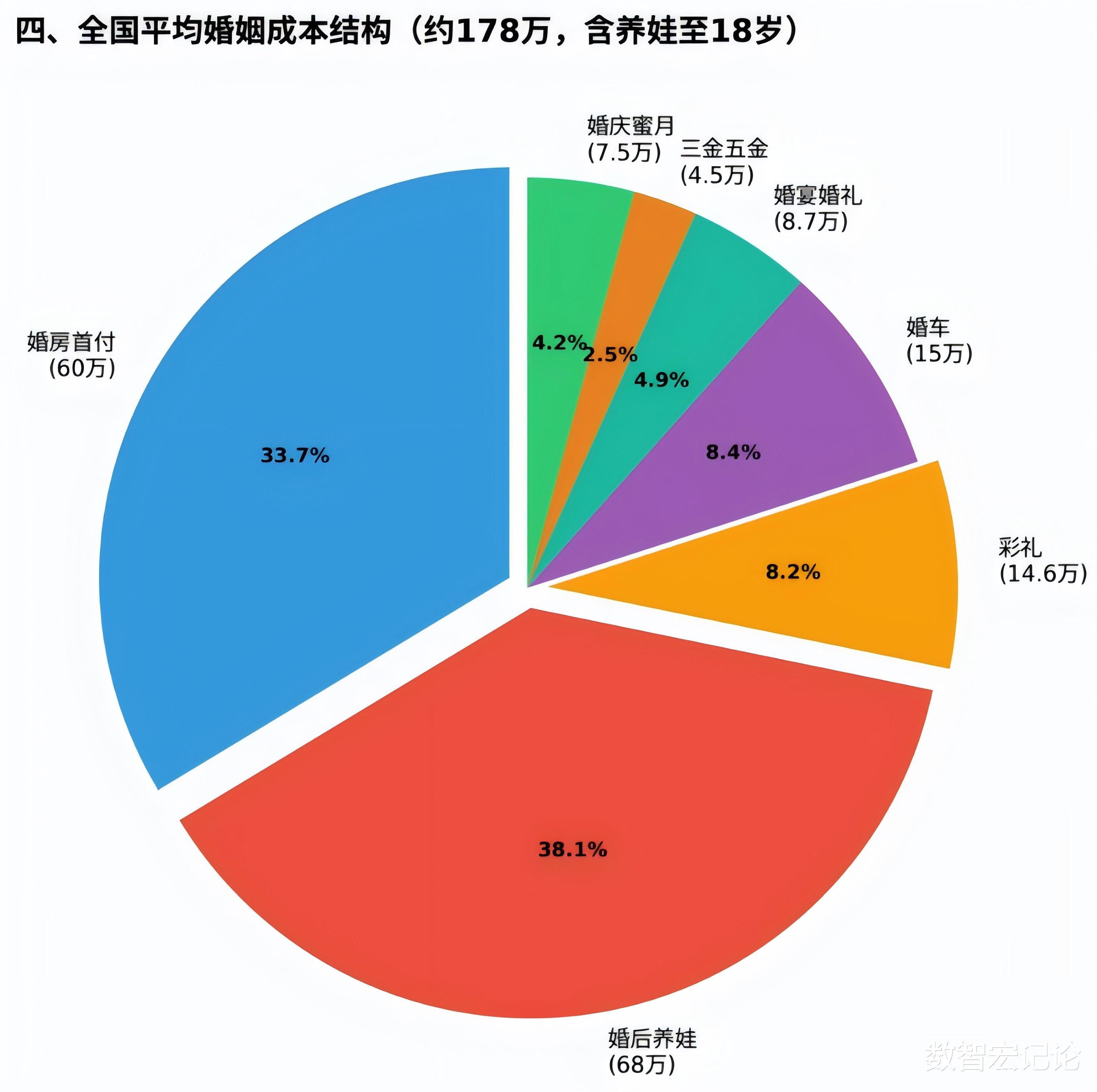 成本结构:婚房首付33.7% + 婚后养娃38.1% = 总成本约72%被这两项吞噬。