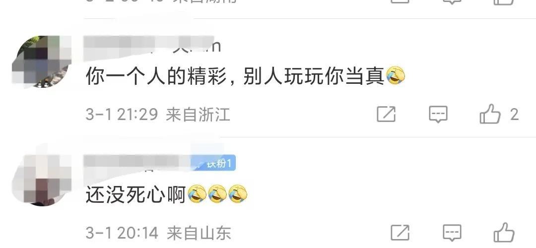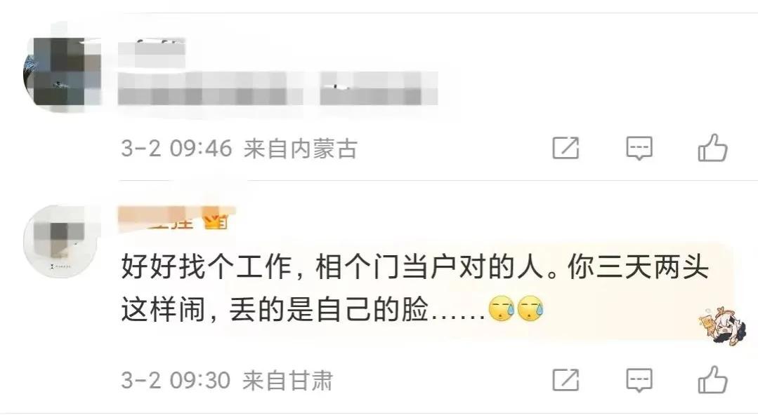 也有网友好言相劝,你一个人的精彩,别人玩玩你当真。还是好好找个工作,找个门当户对的人,何必三天两头的闹,丢的是自己的脸。