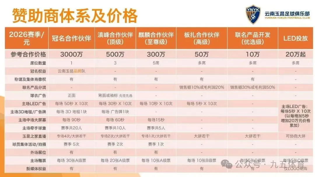 2025年12月发布的2026赛季合作手册中,云南玉昆足球俱乐部设计了清晰的赞助层级:3000万元冠名合作伙伴(含球衣正面广告、主场LED广告等)、500万元背面广告(2席)和500万元袖标广告(1席)、300万元至尊级赞助商(5席)、50万元高级席位与10万元优选级席位(可参与联名产品利润分成)。