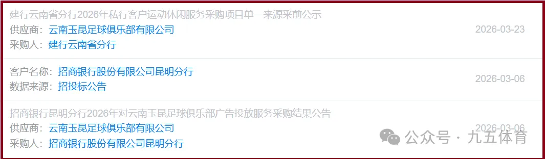 天眼查显示,招商银行昆明分行2026年对云南玉昆足球俱乐部广告投放服务的采购工作已结束、建设银行云南省分行2026年私行客户运动休闲服务采购项目也结束了,唯一的供应商是云南玉昆足球俱乐部。