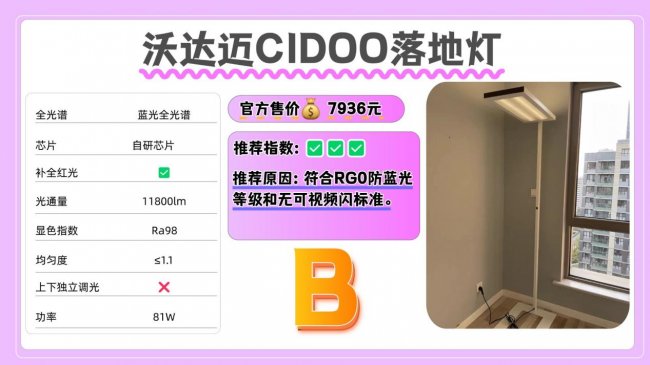 护眼大路灯第六名:沃达迈CIDOO落地灯;符合RG0防蓝光等级和无可视频闪标准。