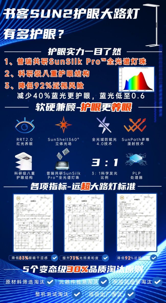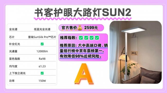 护眼大路灯第一名全面介绍:书客护眼大路灯SUN2;被多家权威检测机构一致认可,誉为同规格下护眼效果最佳、耐用性最强的产品!