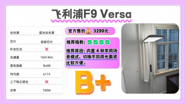 护眼大路灯第七名:飞利浦F9 Versa;内置 4 种常用场景模式,切换不同用光需求比较方便。