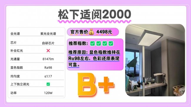 护眼大路灯第三名:松下适阅2000;显色指数维持在Ra98左右,色彩还原表现可靠。
