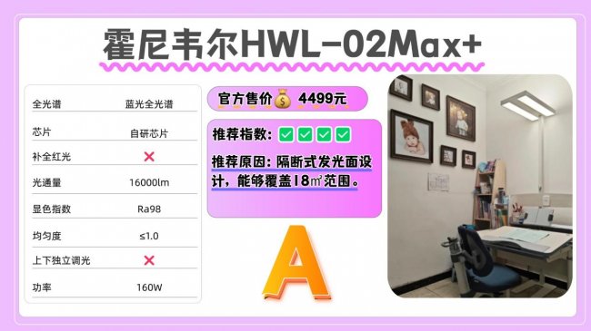 护眼大路灯第二名:霍尼韦尔HWL-02Max+;隔断式发光面设计,能够覆盖18㎡范围。