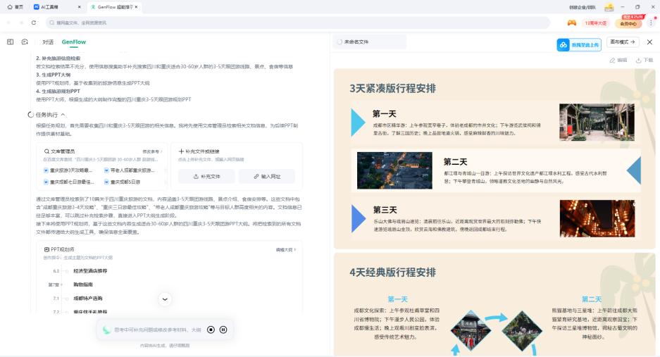 以“极点商业”的实际体验为例,只需输入“为某客户定制一份重庆、四川为目的地的旅游计划,并生成PPT”,GenFlow3.0将帮你自动生成一份包含目的地介绍、交通安排、美食推荐的完整方案PPT,实现了从指令到专业成果的端到端交付,极大地解放了重复劳动力。