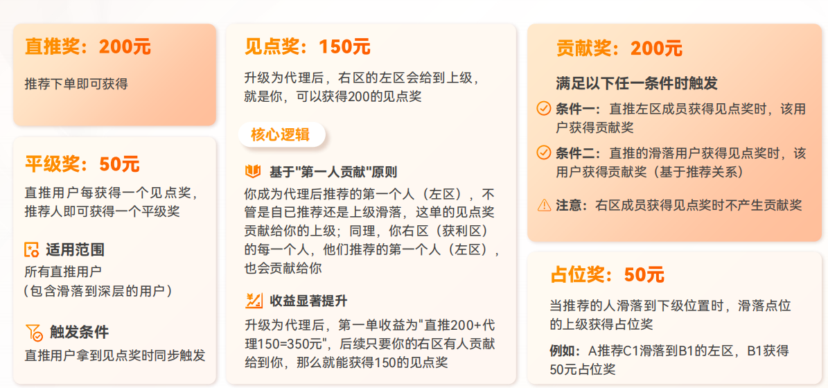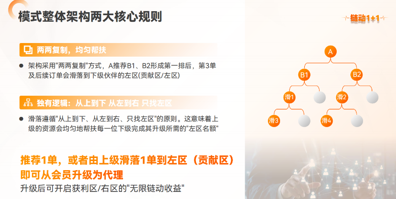 身份升级条件:推荐1单,或上级滑落1单至你的左区,即可从“会员”升级为“代理”,开启右区收益权限。