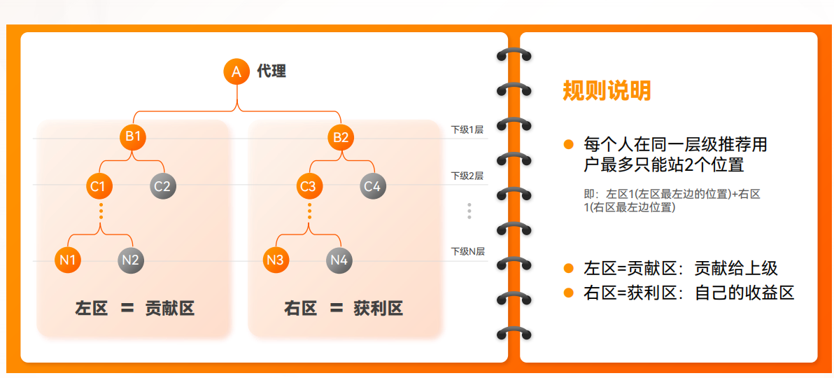 收益路径遵循“第一人贡献”原则:你成为代理后推荐的第一个进入左区贡献给上级;此后你右区每个人推荐的第一个,也将贡献给你。