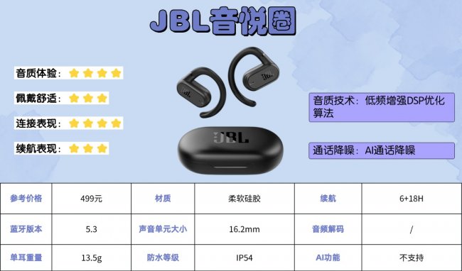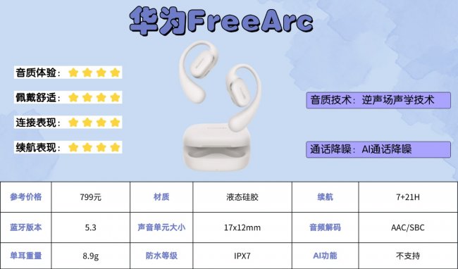 配置上,耳机采用蓝牙5.3方案,连接快且稳定。定向传声技术有效减少漏音,提升了聆听的私密性;通话方面配备双麦克风与AI降噪算法,能智能过滤环境噪音,确保人声清晰自然。耳机具备IPX4级防水,能从容应对汗水或细雨,进一步拓展了使用场景。