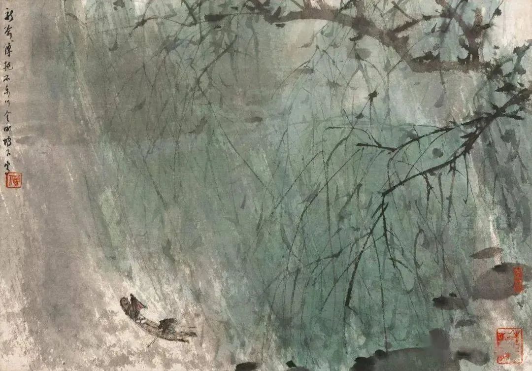 他画柳最爱配"雨"。湿墨晕染的云气从柳根升起,与柳叶的绿混在一起,分不清是雨是雾;偶尔用焦墨点几个雨点儿,砸在柳丝上、水面上,像在听"滴沥"的响。这种"雨柳",是傅抱石的独家记忆——他生于南昌,长于江南,太懂雨里的柳有多销魂,一笔下去,全是乡愁。