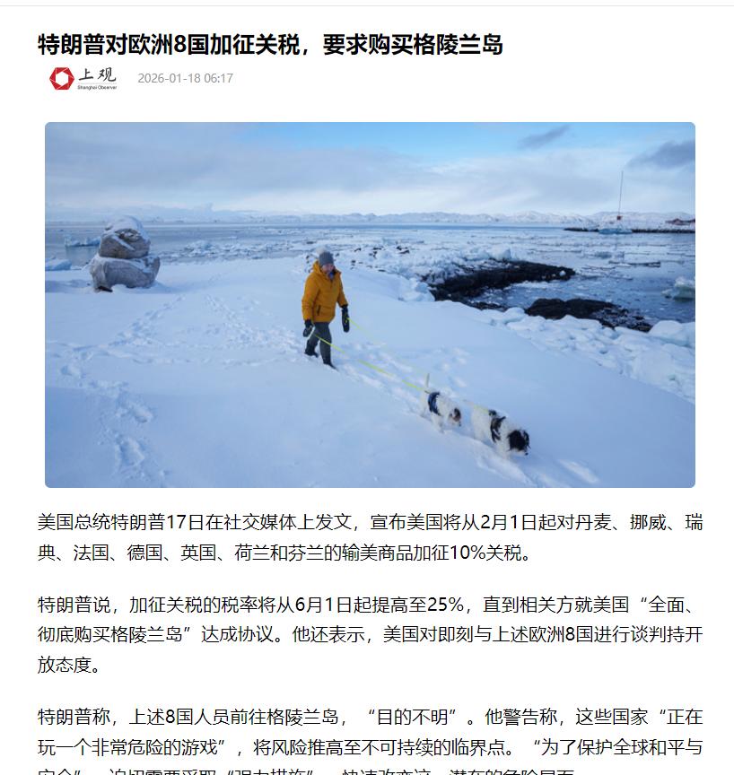 特朗普又因格陵兰岛放出硬话,拿关税威胁欧洲多国,想逼对方妥协换取这座岛屿。