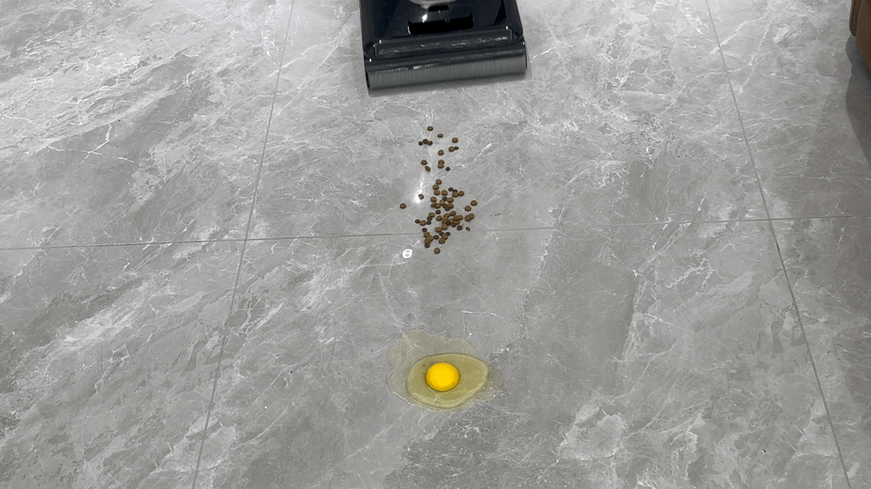 家里养着三个猫主子,猫粮被三个小祖宗弄的到处都是的场面很常见,猫砂盆附近的不明物,也是常有的事情。所以,我又专门设置了一个这样的场景:散乱的猫粮和鸡蛋(模拟猫砂盆附近的不明物),现在来看看美的净味洗地机S60是否能清理干净。