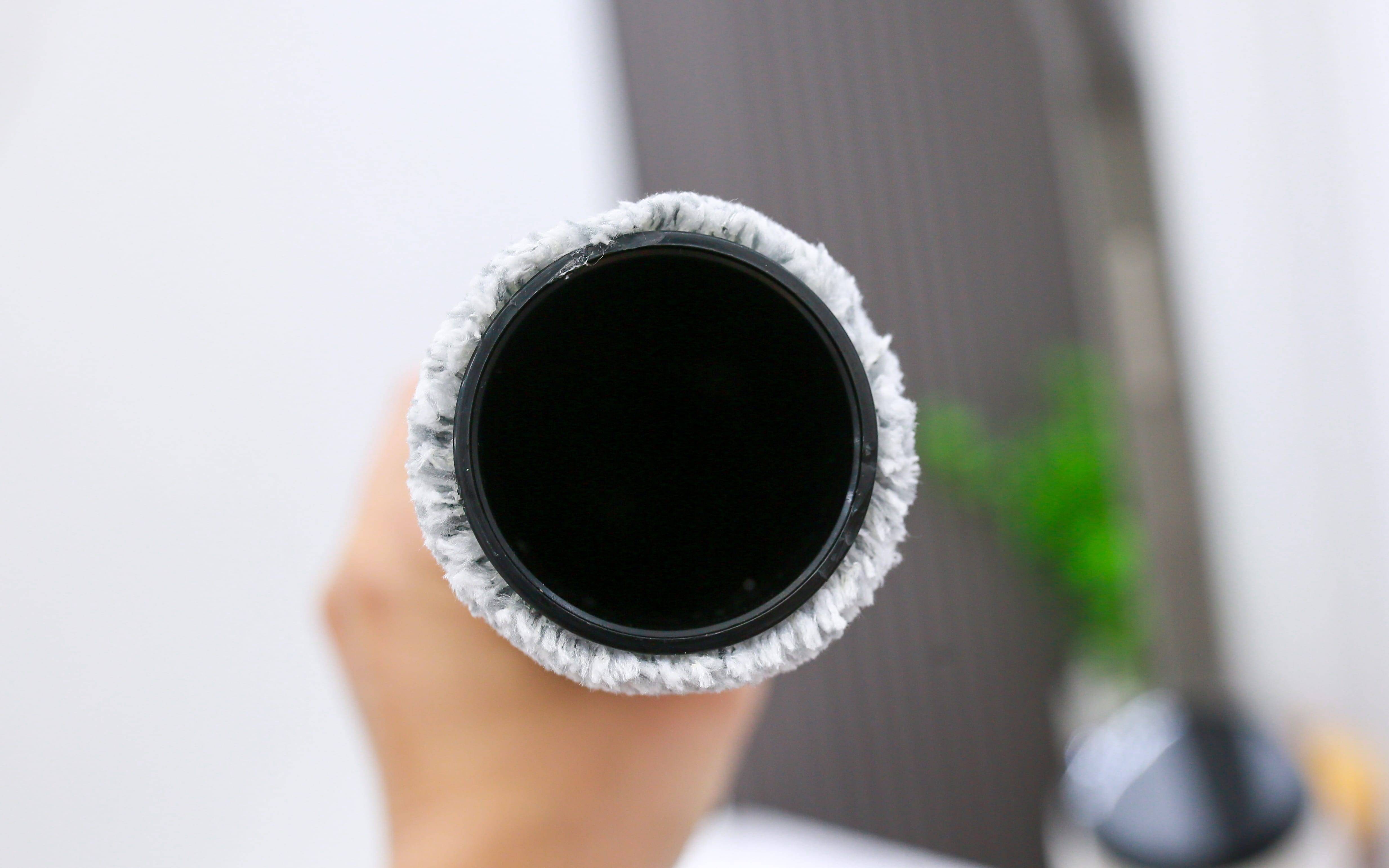 滚刷握着手感特别实在。滚刷材质一点都不像传统那种稀薄的“抹布头”,它是那种高密度复合材质,摸上去就知道吸水性绝佳,像一块能呼吸的地板抛光布。整块拖布结构紧实,边缘缝线细致,卷起来不掉毛、不变形。