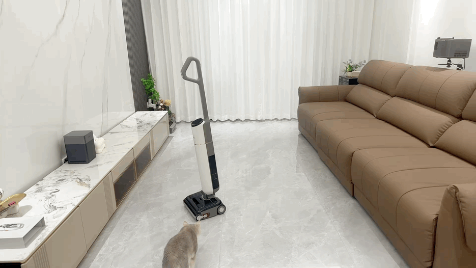 它的大口径吸入通道,不仅能把毛发顺利带走,连干湿混合的垃圾(比如猫粮、鸡蛋液、瓜子壳混着汤汤水水那种)也能一起吞进去,整个吸入过程非常顺畅,不会像有些机器一样中途卡顿、堵管。这样一来,既解决了毛发缠绕问题,又避免了吸尘通道被湿垃圾堵住,后续自清洁时也能冲刷得更彻底,真正做到省心省力不脏手。