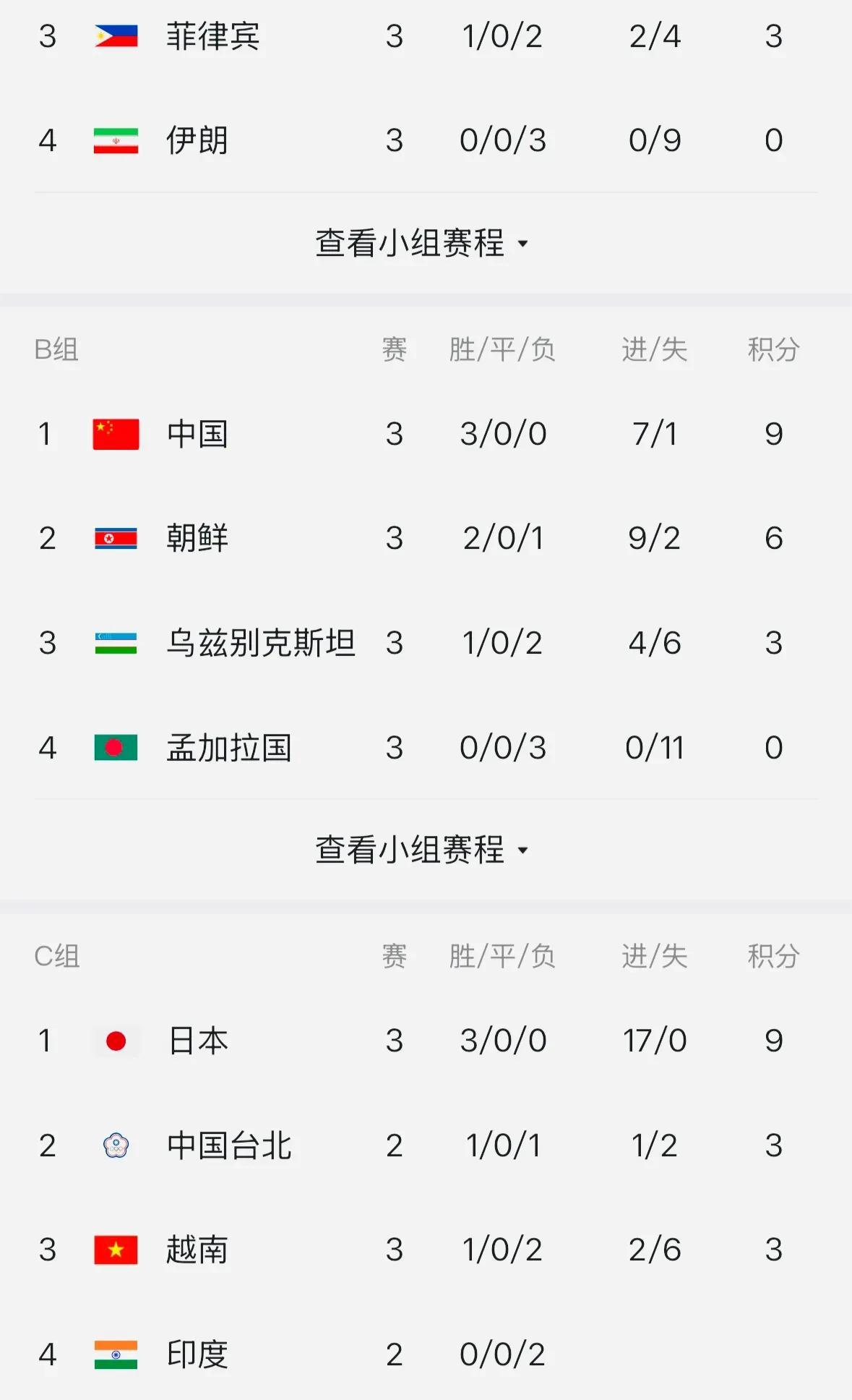 C组首轮比赛中,日本女足首轮以2-0小胜中国台北女足,越南女足以2-1战胜印度女足,第二轮比赛,日本女足以11-0大胜印度女足,中国台北女足1-0击败越南女足,这样一来,日本女足提前一轮晋级八强。