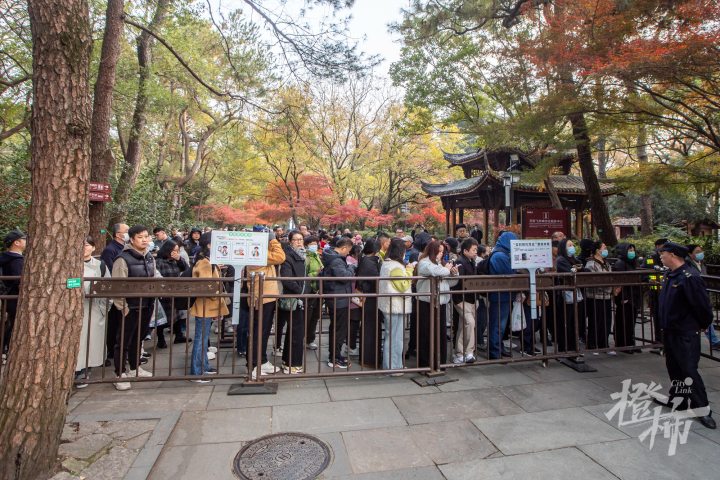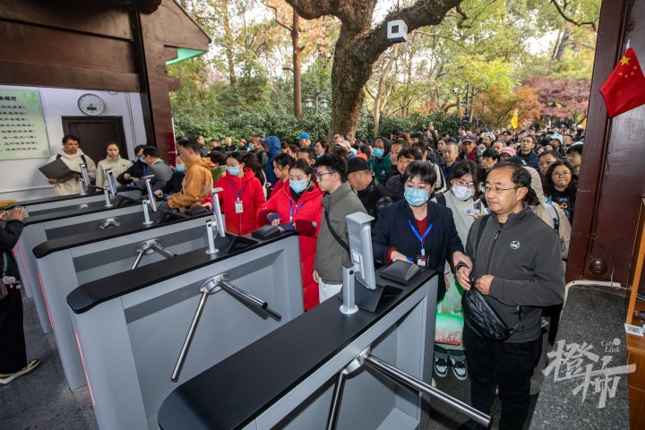 免票预约实行首日,早上7点,橙柿互动记者来到灵隐飞来峰景区,在检票口外,已经有众多市民游客在排队等候,其中有不少是旅游团队。