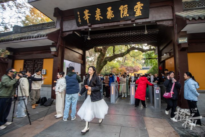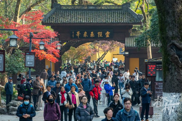 每年这个季节,还是飞来峰景区的“颜值巅峰”期,沿着冷泉溪走,在去往灵隐寺的主通道上,七叶树、枫香、鸡爪槭、红枫,错落分布,深深浅浅的金黄、或浓或淡的嫣红,五彩缤纷,怎么拍都好看。