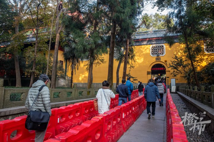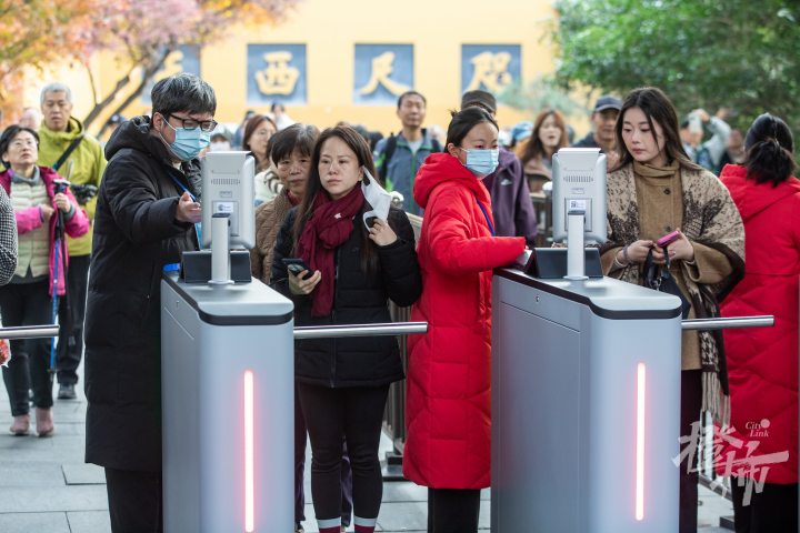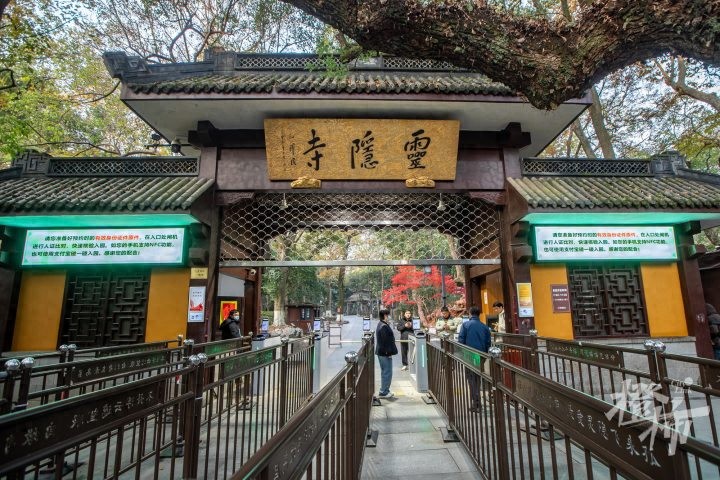 7:30景区开门,游客有序刷身份证入园。入口处检票闸机已全部升级更新,景区实行“一人一证”核验机制,需要提前一天在“杭州灵隐飞来峰”小程序预约,现场刷身份证即可快速入园。所以今后来灵隐飞来峰景区,请一定要记得带好身份证原件。