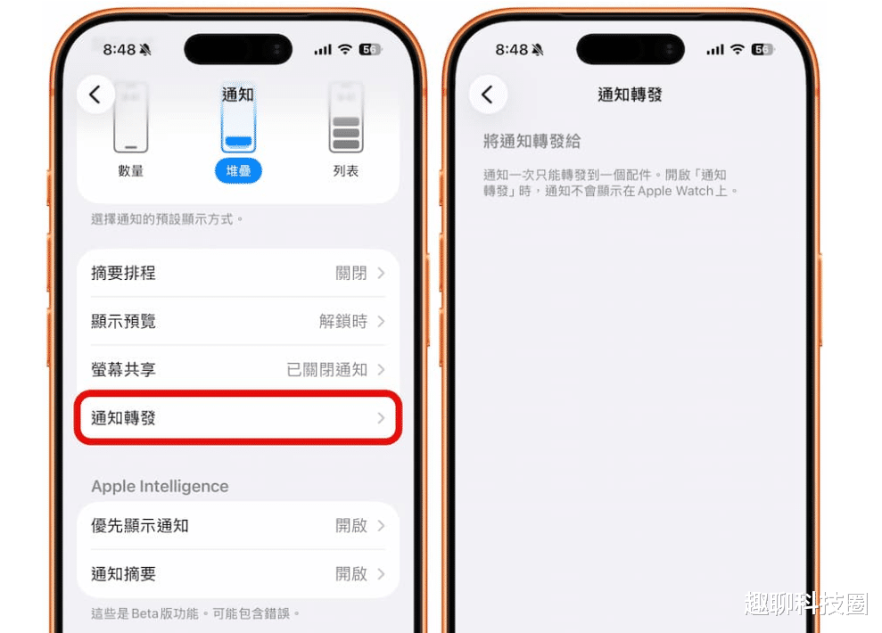不过大家得注意看官方的说明哈,这个功能目前是一旦启用,通知就只能转送到这一台设备上,也就是说,如果你开启了这个通知转送功能,那你手上的 Apple Watch 可就会“罢工”,停止接收和显示来自 iPhone 的通知喽。