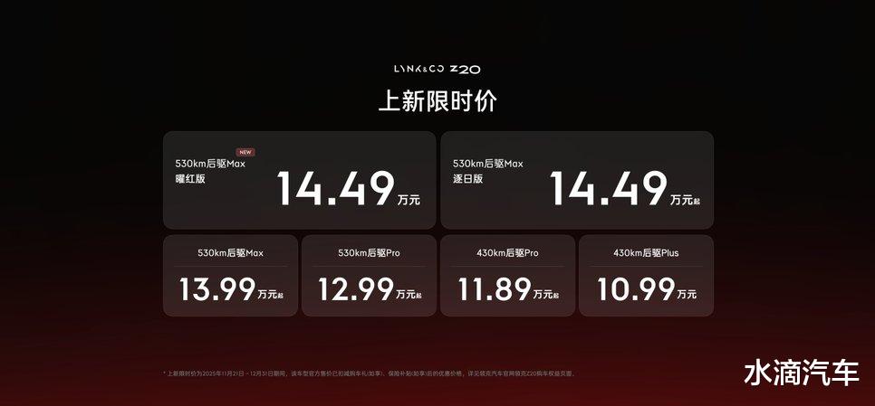 2025年11月21日,广州车展迎来一抹惊艳色彩。领克Z20 530km后驱Max曜红版正式亮相,以14.49万元的限时惊喜价开启预订。此刻起,通过领克官方APP即可锁定这款智趣驾享纯电SUV,尊享多重购车礼遇。值得关注的是,在2025年11月21日至12月31日期间成功锁单并提车的前200位用户,将额外获赠价值666元的“LYNK & CO Z20 × 非必要不合作Nidea·Nlight”联名电气灯,为精致生活添彩。