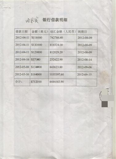 2012年4月11日至2012年4月16日及2012年5月8日至2012年5月16日分别从哈尔滨银行大连分行贷款金额(美元)$11.8万元、$13万元、$12.9万元、$3.7万元、$13.4万元、$16.4万元。共计71.2万美元,打入齐某提供的大连昊远服装有限公司账号。