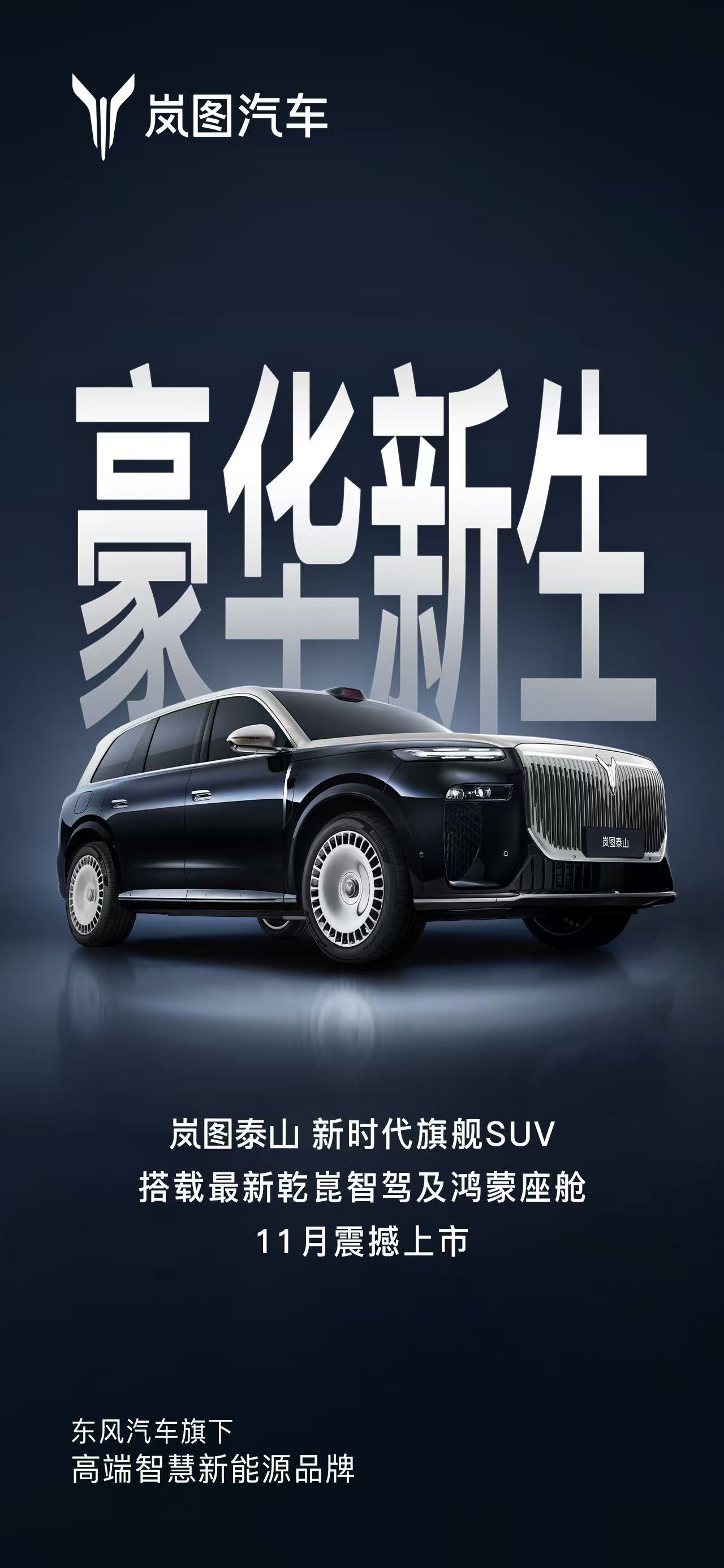 【10月20日,武汉】今日,岚图汽车正式宣布,新时代旗舰SUV——岚图泰山将于11月重磅上市。作为岚图年度压轴“豪”车,岚图泰山拥有与问界M9、尊界S800“智能同源”的尖端技术,搭载顶配版华为乾崑ADS 4与鸿蒙座舱5,将成为旗舰“9系”豪华SUV市场极具竞争力的产品。