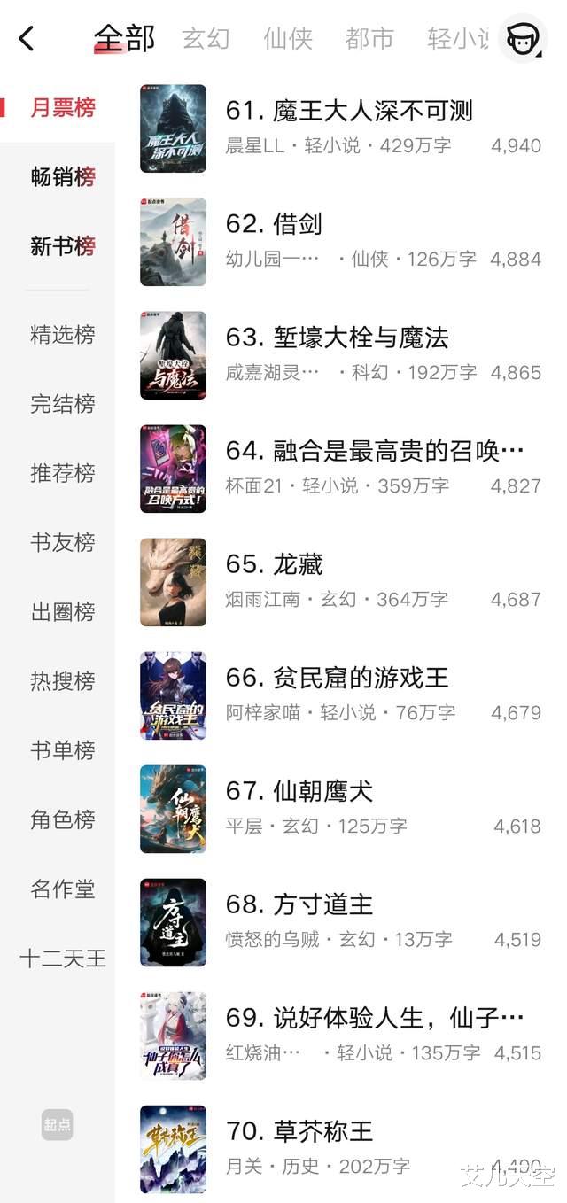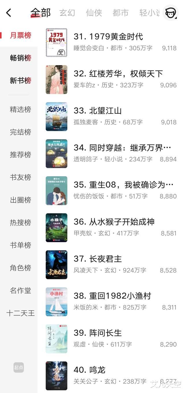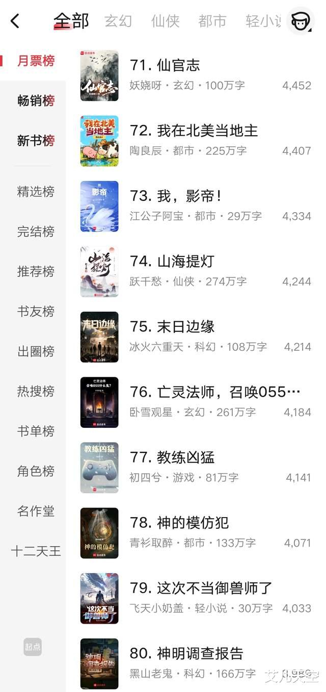 那么以上就是这个月第二周起点月票榜前百一些作品的排名情况了,还是简单记录一下,我们下期再见。