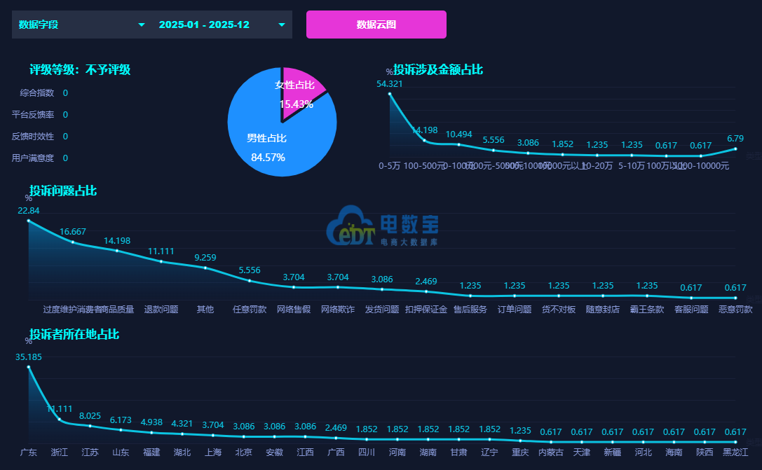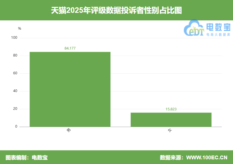 根据网经社旗下电商大数据库“电数宝”显示,投诉“天猫”男性用户投诉比例为84.177%,女性用户投诉比例为15.823%。