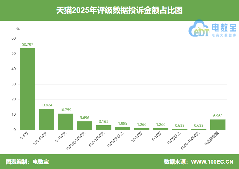 用户投诉“天猫”的消费金额主要在0-5万、100-500元、0-100元、1000-5000元、500-1000元、10000元以上、10-20万、5-10万、100万以上、5000-10000元、未选择金额区间。