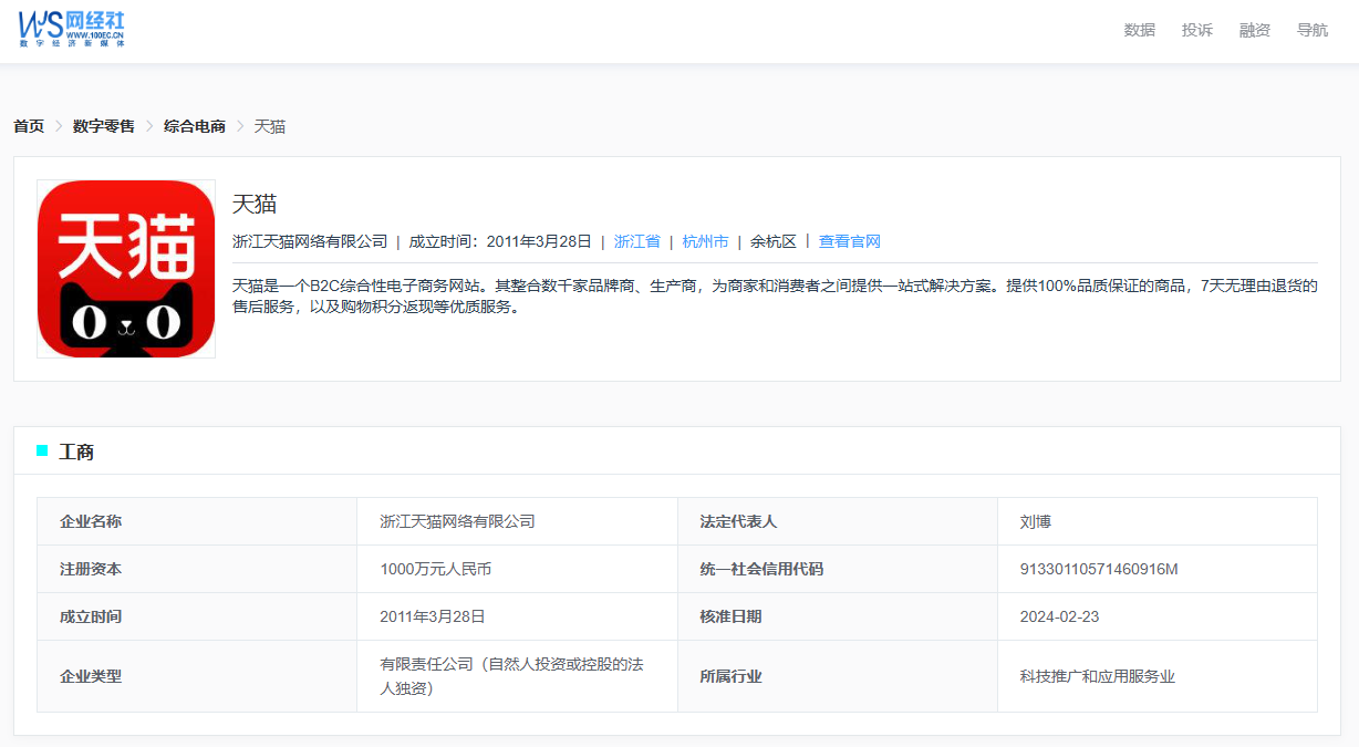 据网经社企业库显示,“天猫”隶属于浙江天猫网络有限公司,成立于2011年3月28日,注册于浙江省杭州市余杭区,法定代表人为刘博。
