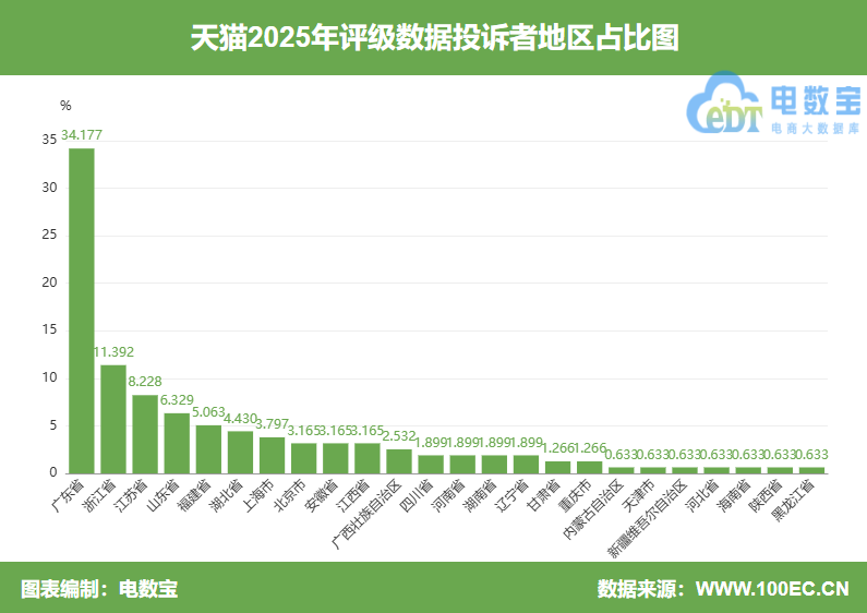 根据网经社旗下电商大数据库“电数宝”显示,2025年投诉“天猫”的用户主要集中地区为广东省(34.177%)、浙江省(11.392%)、江苏省(8.228%),其于分别为:山东省、福建省、湖北省、上海市、北京市、安徽省、江西省、广西壮族自治区、四川省、河南省、湖南省、辽宁省、甘肃省、重庆市、内蒙古自治区、天津市、河北省、海南省、陕西省、黑龙江省等。