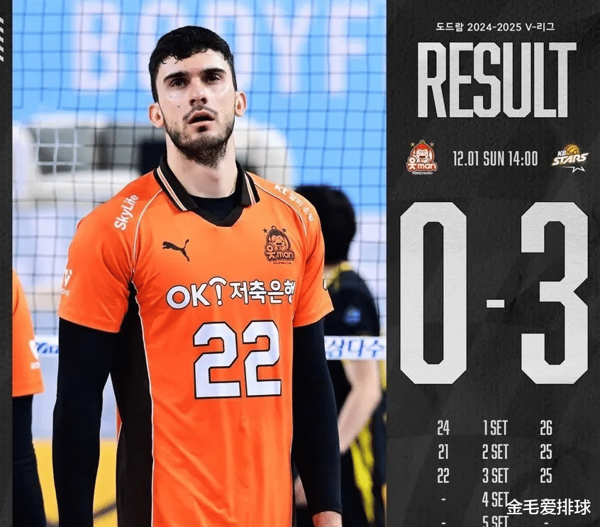 韩国男排联赛中,KB保险3-0(26-24/25-21/25-22)击败了北京主攻张秉龙所在的OK储蓄银行。张秉龙效力的OK储蓄银行3连败,同时吞下赛季第9败,目前2胜9负积7分排名垫底。