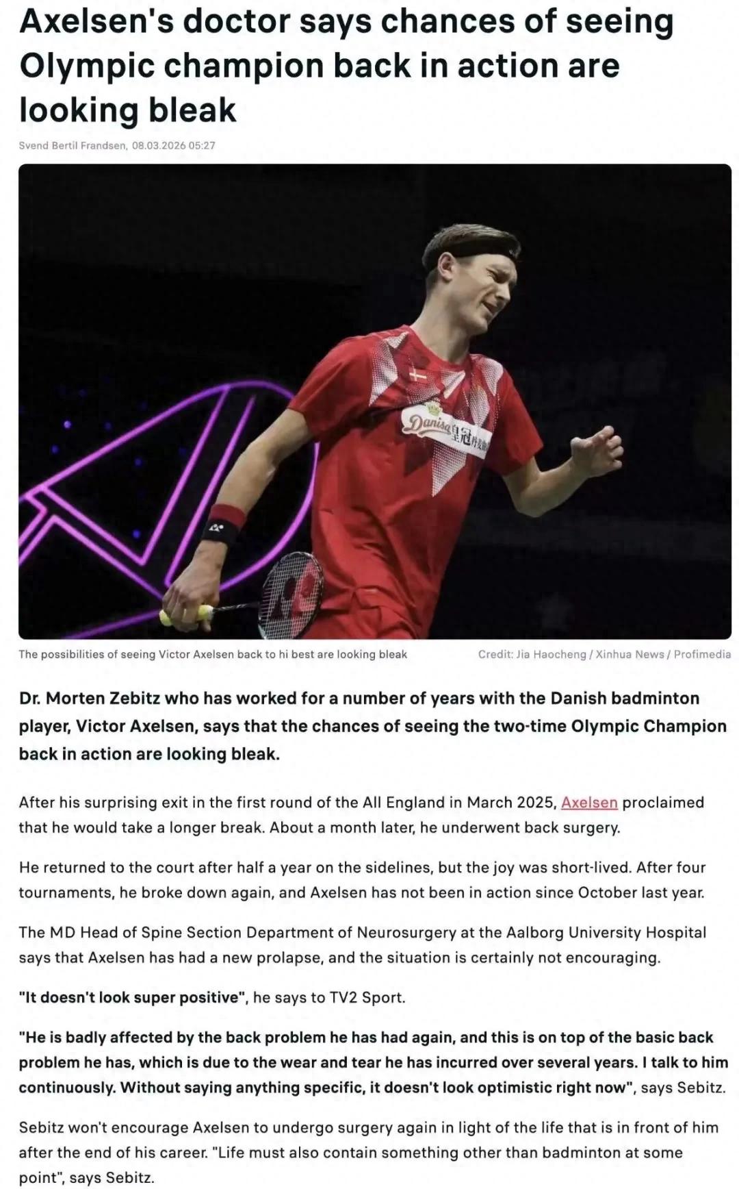 据丹麦媒体报道,两届奥运会羽毛球男单冠军、丹麦名将安赛龙的职业生涯,将面临严峻考验。与其合作多年的主治医生莫滕・泽比茨,近日在接受丹麦媒体采访时坦言,安赛龙重返赛场的可能性已变得非常渺茫。