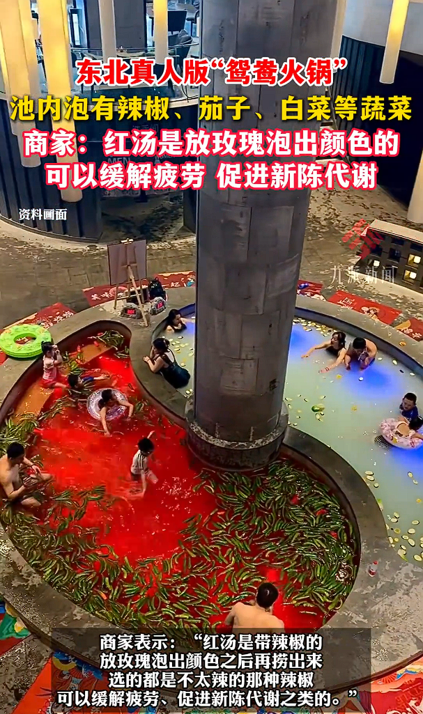 黑龙江一温泉度假村推出“鸳鸯锅”主题浴池:直径5米的圆形温泉被隔成红白两区。红汤池漂浮着20斤真辣椒与塑料螃蟹,辅以玫瑰染色模拟麻辣锅;白汤池则注入牛奶、红枣和枸杞模仿骨汤。游客如“食材”般浸入池中拍照,视频迅速登上热搜,单条播放量超百万。商家宣称此为“视觉艺术”,但承认辣椒两天更换一次,且红汤仅靠染色实现“麻辣视觉效果”,引发“虚假宣传”质疑。