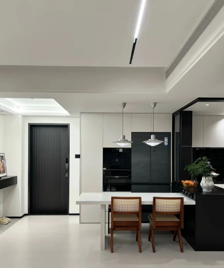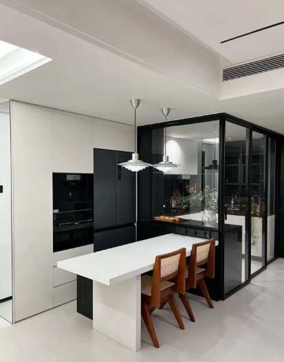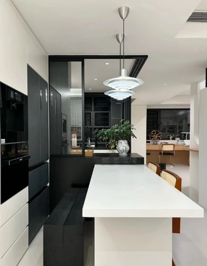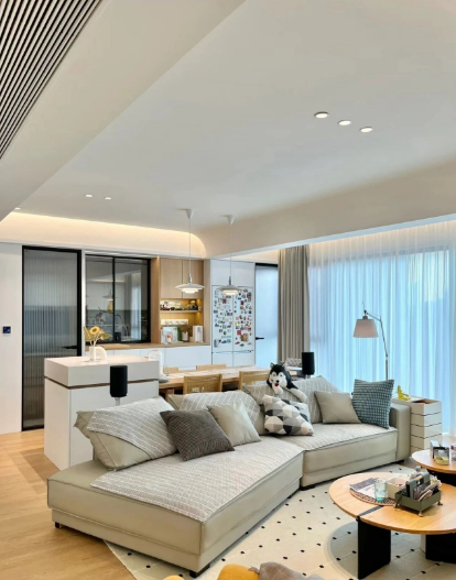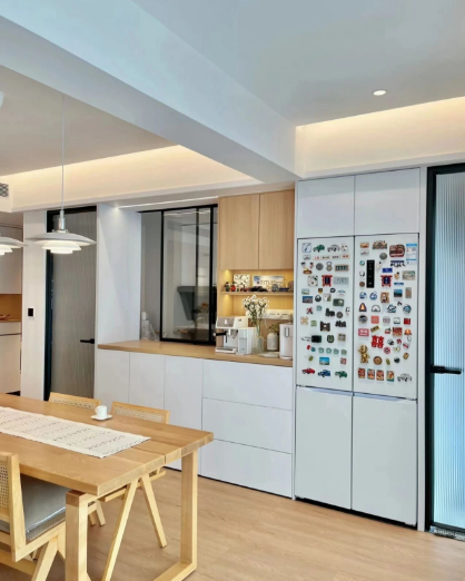 半开放式直接把厨房和客厅、餐厅打通,视觉上连成片,瞬间感觉家里大了一圈,再也不会有那种 “做饭像蹲小隔间” 的压抑感,整个屋子都亮堂通透多了!