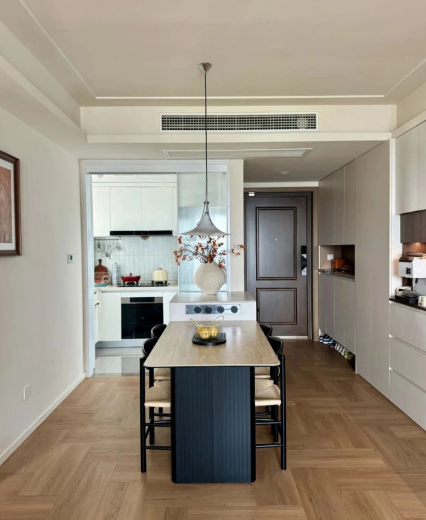 比如做个吧台当隔断,平时能当餐桌吃饭,朋友来还能当临时操作台;或者装矮柜,既能划分区域,又能囤点锅碗瓢盆,把每寸空间都用明白。