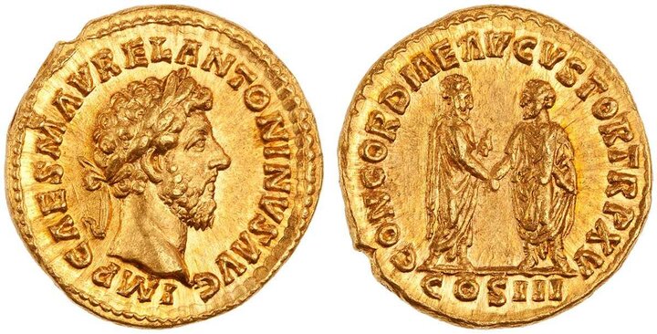 马可·奥勒留时期金币,正面为其桂冠头像,背面字样奥古斯都们的和谐,象征马可与卢修斯共治,公元161年