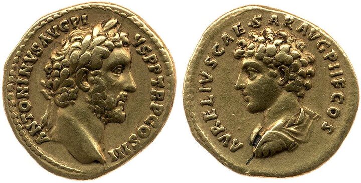 安东尼·庇护时期的金币,正面为其桂冠头像,背面为青年马可·奥勒留像,罗马,约公元140年