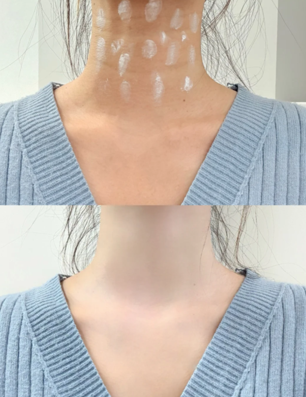 早上出门前几分钟,取适量均匀点涂在脸上,轻轻拍开就能快速成膜,不用隔离、不用粉底、不用定妆,就能快速遮盖脸上的泛红、浅痘印、肤色不均,同时打造出自然通透的亮白肌,不是死白假白的面具感,是那种天生好皮肤的通透质感,持妆一整天也不会暗沉、不会脱妆,日常通勤、约会、出差、短途出行都能轻松 hold 住,哪怕是带妆一整天,皮肤也不会觉得闷,依然保持水润透气的状态,真正实现了 “涂了像没涂,却比素颜好看太多” 的伪素颜效果。
