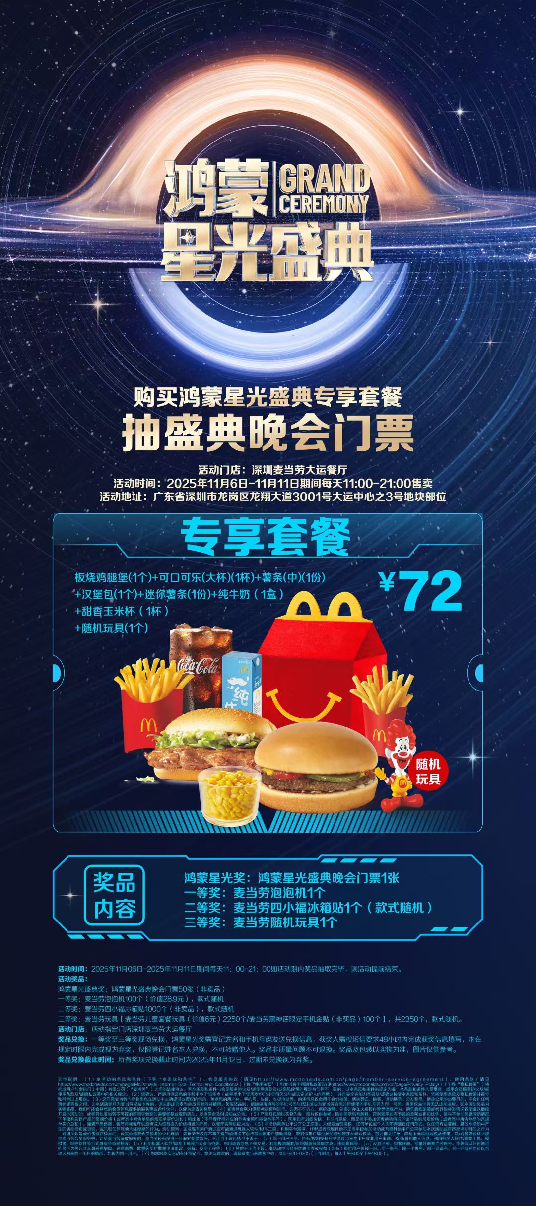 深圳的“麦门信徒”速集合!大运中心麦当劳餐厅专门推出了“鸿蒙星光盛典专享套餐”,购买限定套餐就有机会抽取盛典门票。活动截止到11月11日,还剩最后一天,过时不候!