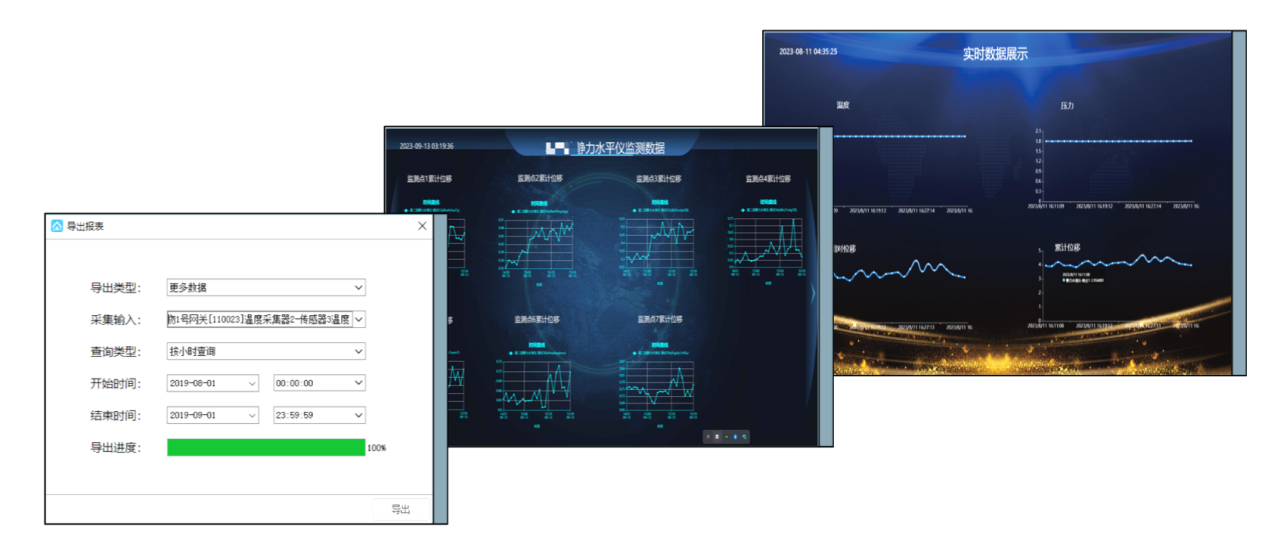 变焦视觉位移监测:只需在安锐测控云平台将以上工作进行自动化完成,监测完的数据就可以直接看数据,而且数据展现形式多样,有折线图、柱状图、仪表盘等报表展现形式,还能将数据以Excel形式导出。